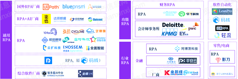 当前中国市场中的RPA厂商大致可以分为两类:基于多种业务流程进行自动化的通用RPA和基于特定流程及逆行自动化的专用RPA。其中,专用RPA厂商具体还可以区分为基于没有明显业务属性的通用业务流程的功能RPA和基于特定行业业务流程的行业RPA(如金融行业RPA等)。目前均有多种厂商试图从不同的角度切入RPA市场。