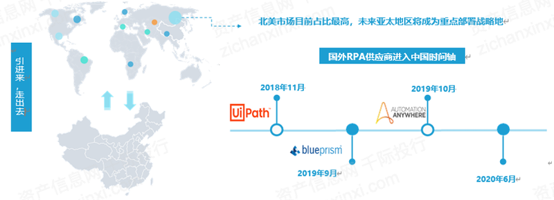 2018年11月,UiPath率先迈进中国市场,随后Blue Prism、Automation Anywhere等也在2019年步入战地。2020年6月,微软宣布旗下RPA产品“microsoft Power Automate”在华商用,短短两三年时间,中国成为RPA龙头供应商云集之地。与此同时,中国RPA供应商也在尝试走向全球,主要目标为亚太地区,该地区正成为全球RPA供应商重点部署战略地。