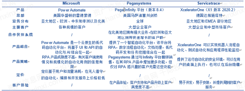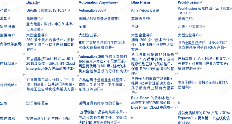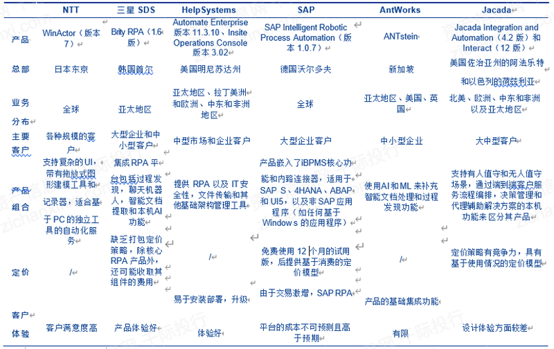 全球参与者主要有:UiPath(PATH)、Automation Anywhere、Blue Prism(PRSM)、WorkFusion、Nice(NICE)、Edge Verve Systems、Kofax(KFX)、日本电报电话公司(NTT)、三星SDS(018260)、SAP(SAP)、HelpSystems、AntWorks、Jacada(JCDA)、微软(MSFT)、Pegasystems(PEGA)、Servicetrace等。