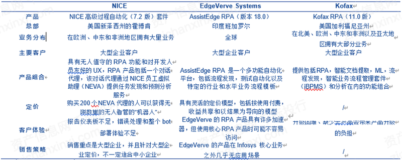 RPA在NICE拥有15年左右的历史,作为产线之一为NICE的云呼叫服务提供自动化服务,其特色是可基于全渠道分析门户发现更多业务场景,且既具有本地化服务功能,又可基于云进行扩展。目前围绕RPA主要有三大产品:Robotic Automation、NEVA Attended Automation和Desktop Analytics,市场营销策略针对的是大型企业客户——拥有1000多名员工和超过10亿美元收入的组织。