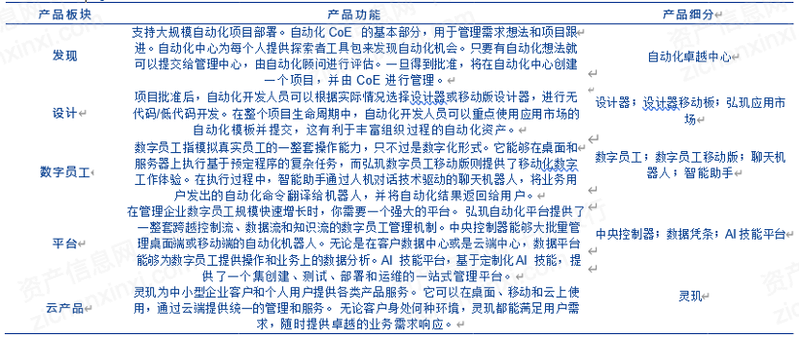 产品主要定位于大规模部署的企业级平台,强调connected-RPA理念,企业做既可以做中央化的治理,但同样可以让业务部门自己去做流程优化,是位于业务&IT部门中间的一个架构平台。目前产品涵盖智能RPA平台、DX平台、ROM支持,生态上拥有社区支持。