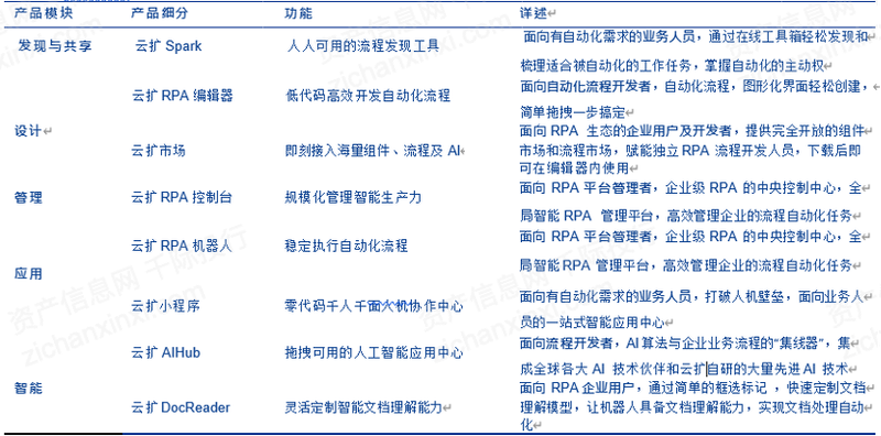 云扩科技提供端到端、全链路的流程管理自动化产品,其功能覆盖发现与共享、设计、管理、应用、智能五个板块。