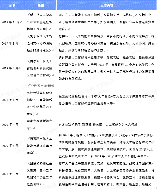 2020年,明确人工智能作为“新基建”建设重要一环,“十四五”指出要推动互联网、大数据、人工智能等同各产业深度融合。并且各省市也在大力推动人工智能与产业融合,打造应用场景,示范项目。