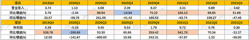 2021年Q3单季度,实现收入3.62亿元,同比增长51.68%,环比下滑47.46%;归母净利润0.38亿元,同比下滑27.72%,环比下滑50%。
