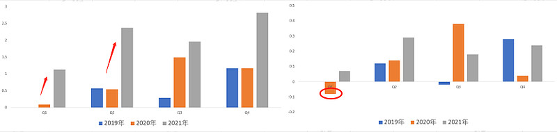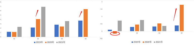 接下来,我们将近近期季度的收入和利润增长情况放在一起,来感知增长趋势: