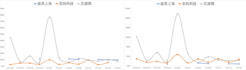 从2021年数据来看,盛美上海在研发费用方面投入更大,在17%左右。另外,由于业务扩张来了收入规模变动较大,导致芯源微研发费用率波动异常。