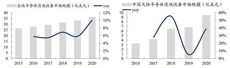 2020年,全球半导体清洗设备市场规模约36.1亿美元,同比增长10%。中国大陆半导体清洗设备市场规模为9.36亿美元,同比增长40%,2016-2020年年复合增速达30.47%。