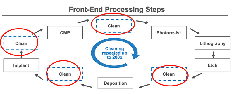 半导体清洗,是芯片制造过程中步骤排在首位的工艺,约占所有芯片制造工序步骤的30%。每一步刻蚀、薄膜沉积、离子注入、抛光等重复工序后,均需要一步清洗工序。