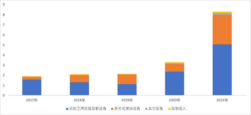 2021年,由于新签订单较上年同期大幅增长,涂胶显影设备收入同比增114.4%,湿法设备同比增长280.56%。