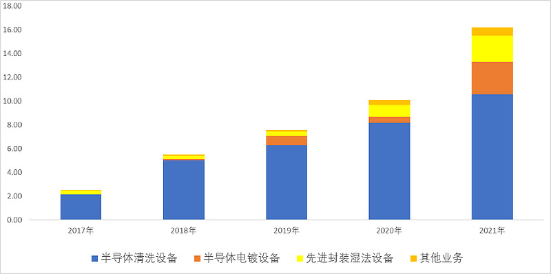 2021年,其半导体电镀设备和湿法封装设备收入占比分别同比提升205.79%、37.42%。主要原因是,自主研发的半导体电镀设备获得下游客户认证,实现批量供货,新增五家中国大陆地区以外的客户。