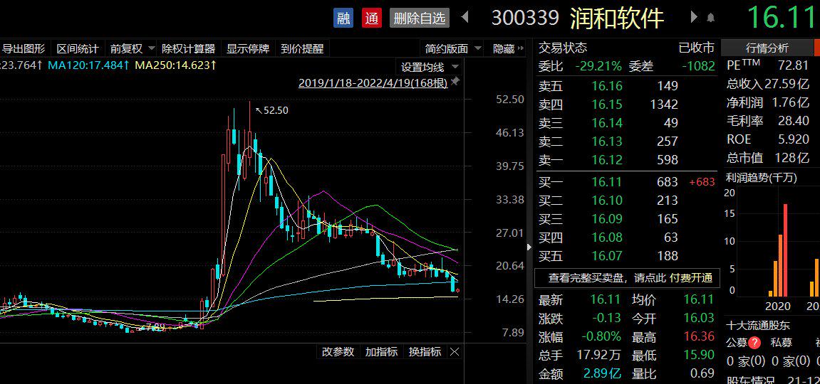 然而,概念炒作的风来得快去得也快,加之股东们疯狂减持,润和软件股价在高位并未悬停太久,就迎来了长达9个月的“坐滑梯”走势。截至4月19日收盘,润和软件总市值仅剩128亿元,相较最高点时418亿元的总市值,如今290亿元的财富被蒸发掉了。