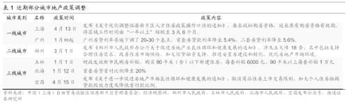 一线城市调整限购、下调房贷利率,信号意义显著。4月13日,上海临港新片区放松购房资格,延长原有购房资格有效期,将区域工作时间由“一年以上”缩短至3或6个月,其中3个月的人才住房政策重点支持单位达195家。1月以来,广州、深圳均不同程度下调房贷利率,广州房贷利率普遍下调了20-30个基点,首套房贷款利率降至5.4%,二套房贷利率降至5.6%。同时期北京下调房贷利率5个基点。