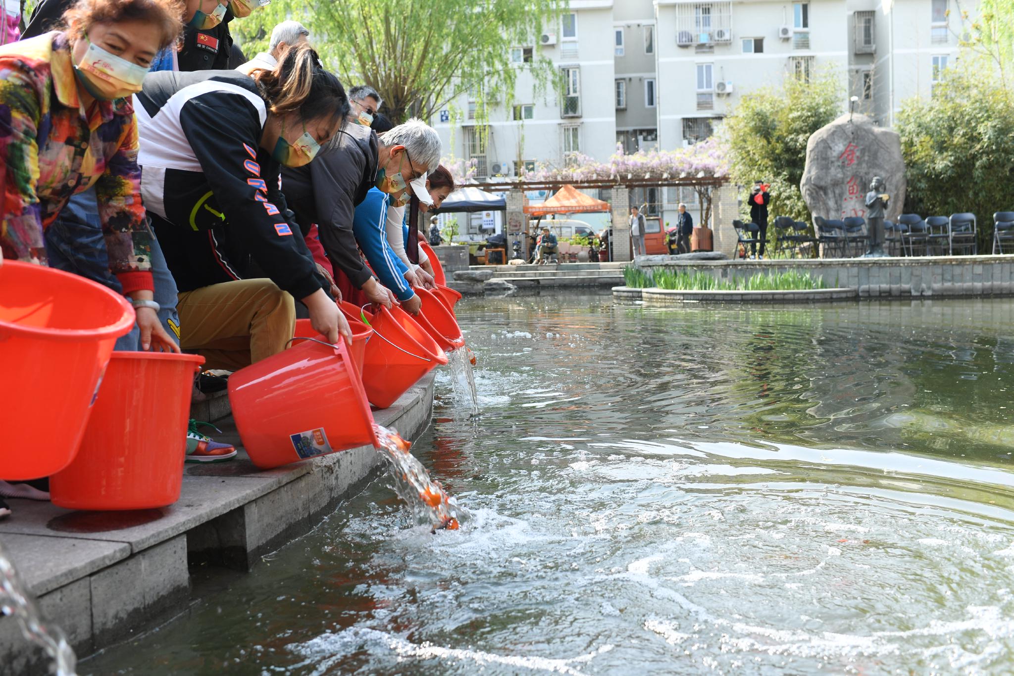4月18日,东城区天坛街道金鱼池社区开展金鱼池回迁20周年纪念活动,居民们相聚在一起,将一尾尾寓意吉祥的金鱼投放到池塘中。今年,天坛街道计划启动金鱼池小区改造提升项目,持续提升居民生活环境。