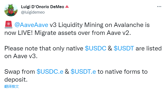 PANews 4月20日消息,据Avalanche DeFi负责人Luigi D'Onorio DeMeo的推文,Avalanche上的V3流动性挖矿现已启动,资产可以从Aave v2迁移。请注意,Aave v3中仅列出了USDC和USDT,可从USDC.e和USDT.e转换为原生形式以进行存款。