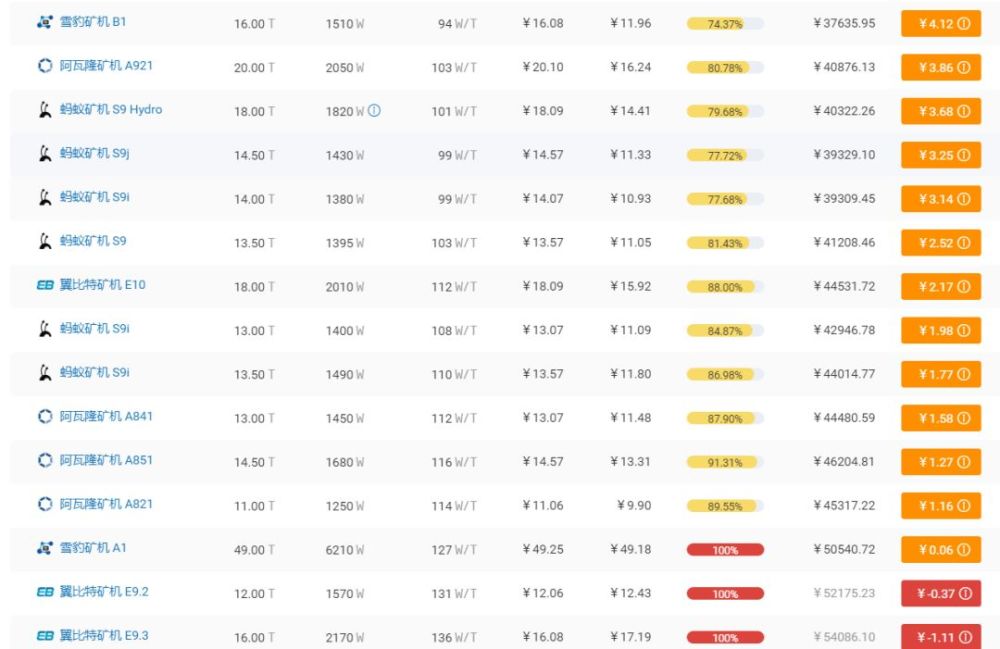 从数据可以看到,已经有12种矿机达到了关机价格。电费占挖矿成本比重超过70%的矿机种类有18种。