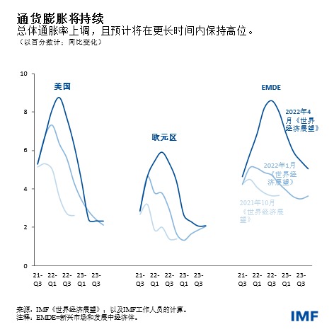 IMF认为,对许多国家来说,通货膨胀已经成为一种明确而现实的危险。甚至早在冲突爆发之前,大宗商品价格飙升和供求失衡状况就已引发了通胀的大幅上升。美联储等多国央行已经着手收紧货币政策。与冲突有关的种种扰动放大了上述压力。目前据IMF估计,通胀水平将在更长时间内保持高位。在美国和欧洲部分国家,在劳动力市场吃紧的背景下,通货膨胀已经达到40多年来的最高水平。