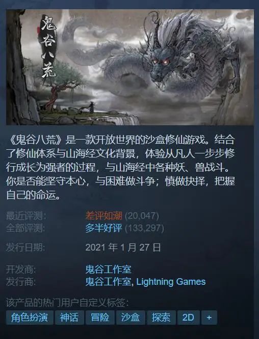 游戏《鬼谷八荒》在前段时间更新了创意编辑器这一玩家期待许久的功能,但因为并未按照此前承诺的使用 Steam 的创意工坊,反而上架了自家的 MOD 制作工具 —— 这个官方编辑器并不好用,让许多玩家感到被背叛,导致游戏近期“多半差评”。