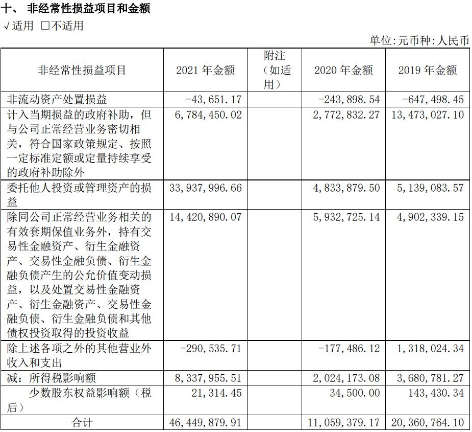 此外值得注意的是,格尔软件2021年扣非净利润仅占其归母净利润的41%左右。第一财经翻阅年报发现,格尔软件计入当期损益的政府补助为678.45万元,委托他人投资或管理资产的损益为3393.80万元,持有交易性金融资产等投资收益1442.09万元,合计逾5500万元。换言之,2021年,格尔软件的投资收益比其主营业务赚得多得多。