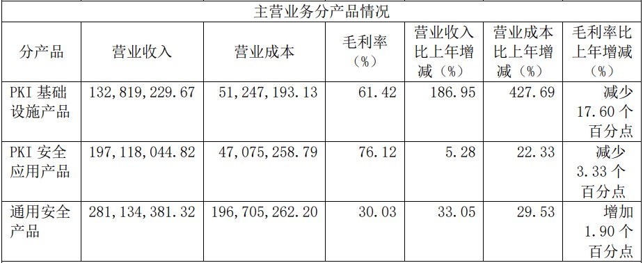 其中,PKI基础设施产品2021年营收大增187%,但其营业成本增幅更高,为428%,该项产品2021年毛利率为61.42%,同比减少17.6个百分点。