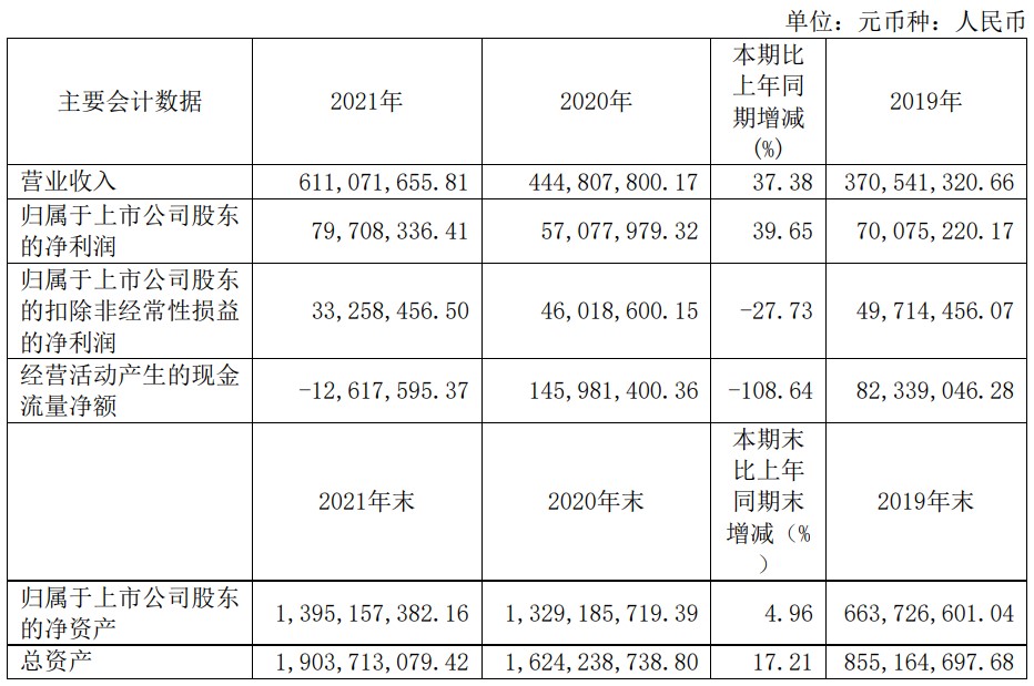 格尔软件(603232.SH)4月25日晚间发布2021年年报。2021年,公司实现营业收入6.11亿元,同比增长37.38%;实现归母净利润7970.83万元,同比增长39.65%;实现扣非净利润3325.85万元,同比下降27.73%。2021年公司经营活动产生的现金流量净额为-1261.76万元,同比下降108.64%。