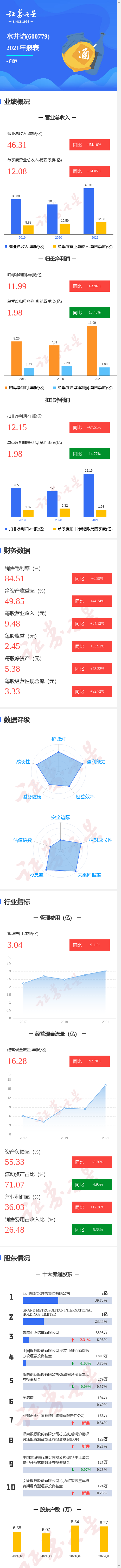 摘要:水井坊2021年报显示,公司主营收入46.32亿元,同比上升54.1%;归母净利润11.99亿元,同比上升63.96%;扣非净利润12.16亿元,同比上升67.51%;其中2021年第四季度,公司单季度主营收入12.09亿元,同比上升14.05%;单季度归母净利润1.99亿元,同比下降13.43%;单季度扣非净利润1.98亿元,同比下降