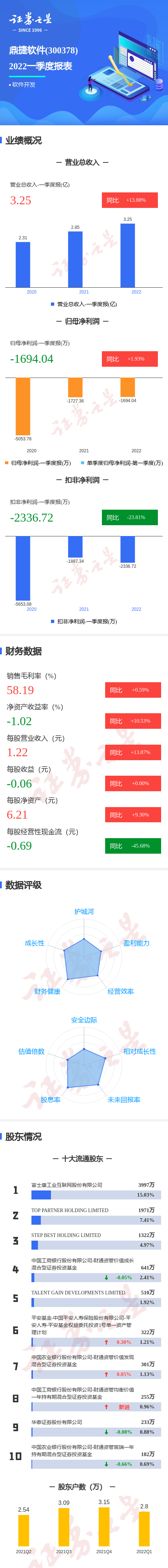 鼎捷软件2022一季报显示,公司主营收入3.26亿元,同比上升13.88%;归母净利润-1694.04万元,同比上升1.93%;扣非净利润-2336.72万元,同比下降23.81%;其中2022年第一季度,公司单季度主营收入3.26亿元,同比上升13.88%;单季度归母净利润-1694.04万元,同比上升1.93%;单季度扣非净利润-2336.72万元,同比下降23.81%;负债率30.03%,投资收益63.73万元,财务费用-62.53万元,毛利率58.19%。