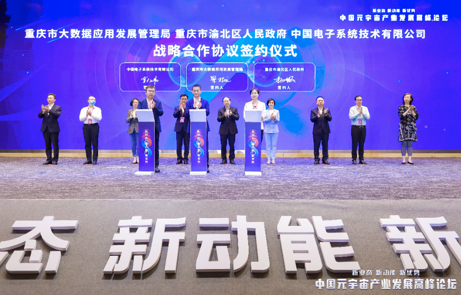 重庆市大数据应用发展管理局、重庆市渝北区人民政府、中国电子系统技术有限公司三方签署战略合作协议,携手助力重庆数字经济和元宇宙产业发展。