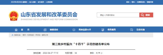近日,山东省发展改革委联合省委组织部等10部门公布了《第三批乡村振兴“十百千”工程示范创建名单》,临朐县列入示范县创建名单,诸城市昌城镇、坊子区九龙街道等12个镇(街道)列入示范乡镇创建名单,潍城区军埠口综合项目发展服务中心杨家庄子村等100个村(社区)列入示范村创建名单。