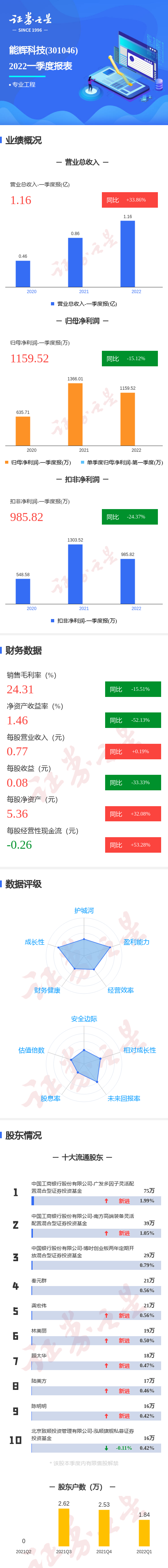 摘要:能辉科技2022一季报显示,公司主营收入1.16亿元,同比上升33.86%;归母净利润1159.52万元,同比下降15.12%;扣非净利润985.83万元,同比下降24.37%;其中2022年第一季度,公司单季度主营收入1.16亿元,同比上升33.86%;单季度归母净利润1159.52万元,同比下降15.12%;单季度扣非净利润985.
