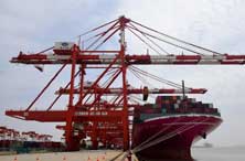 探访在疫情下运转的上海港 4月27日,上海洋山深水港,岸桥起重机正在装卸货物。在上海洋山深水港的四期自动化码头,“ONE WREN”号国际集装箱船正在装卸货物。 28日