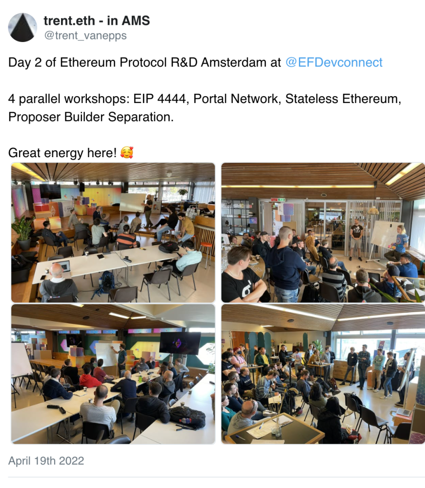 “DevConnect第二天的以太坊协议研发活动,4个平行工作小组:EIP-444, Portal Network,无状态以太坊,提议者-创建者分离。现场能量爆棚。”