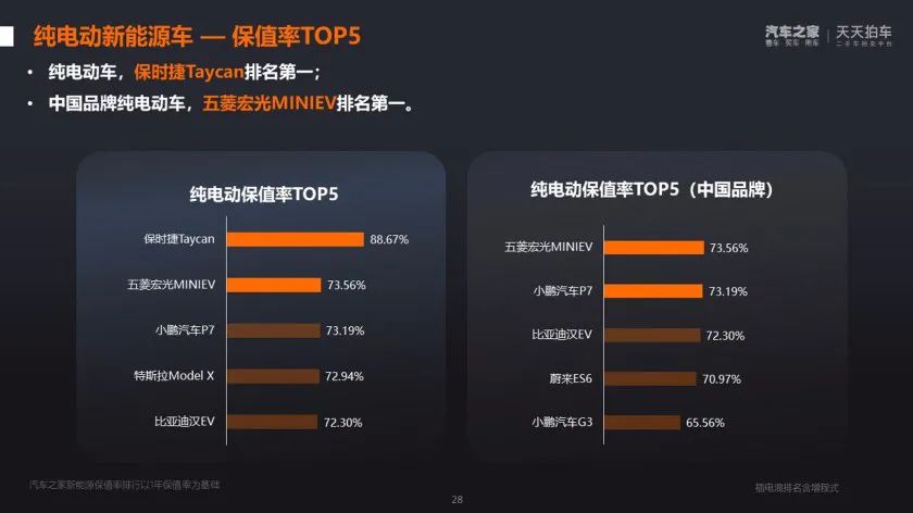 细看这份名单,这奇怪的现象就有点颠覆我们的想象,在我们固有的印象当中,新能源车都是不保值的一类车,如今随着新能源车型的保有量份额不断增大,似乎保值率在一定程度上还超越了燃油车型。除了宏光MINIEV之外,榜上还能看到保时捷Taycan(配置|询价)、小鹏P7(配置|询价)、比亚迪汉EV(配置|询价)以及特斯拉Model X等我们熟悉的车型。如此一来,我们可以得知上至百万,下至三万元不到的纯电车都有着不错的保值率,而实际情况又是如何?