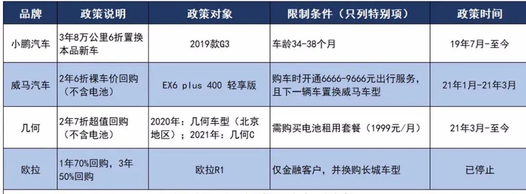 较早前,为了让新能源车更“值”一些,车企和政策均在共同努力。例如,为尽可能地缓解新能源汽车的保值焦虑,作为造车新势力的代表,蔚来正试图构建以车电分离、BaaS电池租用服务、换电模式为基础的售后体系闭环,未来5年将投入30亿元建设并推广官方二手车业务。事实上,由车企出面采取措施来提升新能源汽车保值率的不止蔚来,还有小鹏、威马、几何、欧拉等,但目前威马和欧拉的回购计划已经停止,只剩下小鹏、几何、蔚来了。