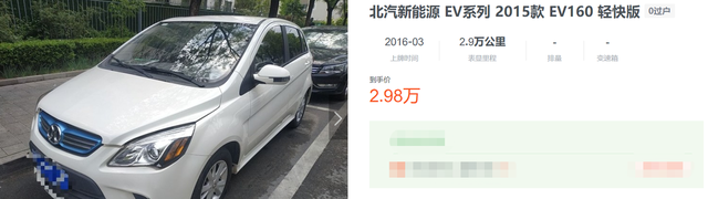 北汽新能源EV:它是根据北京汽车E系列油改电的一款纯电小型车,早期车型的指导价卖到了24.98万元(不含补贴),续航在160-200km不等,并且配备了快充,1小时可以从30%充至80%,电机功率为53kW,零百加速时间需要15秒,搭载的是三元锂电池。后期产品的价格跌到了不到10万元,但续航也降到了150km,电机功率降至45kW,配置方面没啥亮点,现在车龄6年、里程数3万公里左右的二手车,价格在3万元左右。