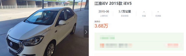 江淮iEV5:同样是一款油改电的纯电小型车,产品特点和北汽新能源EV比较类似,早期产品价格卖到了17万多元(不含补贴),续航里程为170km,采用50kW电机,最大扭矩215牛·米,搭载的是三元锂电池,同样配备有快充。车龄7年、里程数4万公里左右的二手车,价格能卖到3万元左右。