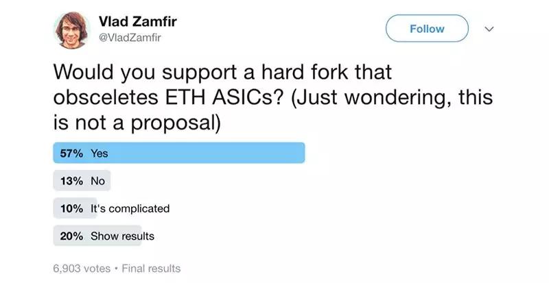 此外,以太坊基金会的开发者 Vlad Zamfir 在推特上提出了同样的问题,询问大家是否支持通过硬分叉让以太 ASIC 矿机失效。截止本文发稿时,有 6900 多人参加了投票,超过 57% 的回应支持这一提案。