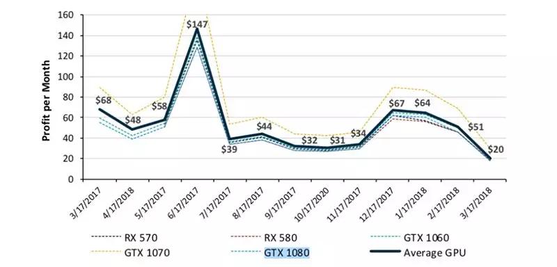 以太币价下跌,加上挖矿难度增加,用 GPU 挖矿的以太坊矿工们利润岌岌可危。据 Rolland 测算,以太坊的矿工每月每个显卡的平均利润曾经能达到 114 美元,现在可能连 20 美元都难保。