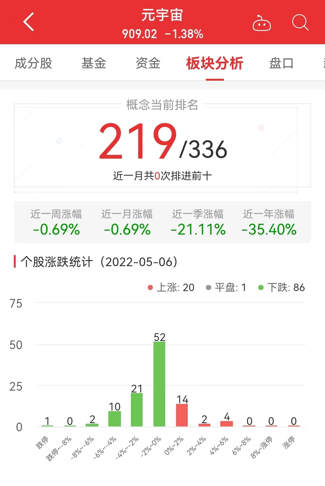 中国经济网北京5月6日讯 今日,元宇宙板块整体涨幅-1.38%,其中20只股票上涨,1只股票平盘,86只股票下跌。