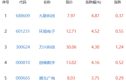 其中,九联科技、环旭电子、万兴科技、创维数字、湖北广电位列板块涨幅前五位,涨幅分别为4.87%、4.52%、4.30%、4.16%、3.75%。