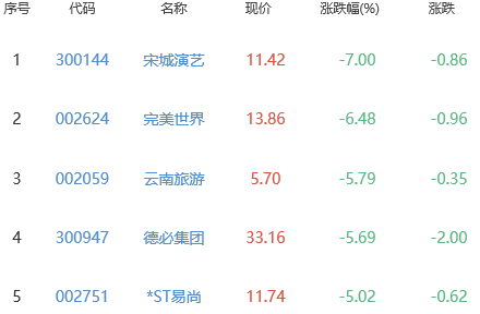 宋城演艺、完美世界、云南旅游、德必集团、*ST易尚位列涨幅榜后五位,涨幅分别为-7.00%、-6.48%、-5.79%、-5.69%、-5.02%。
