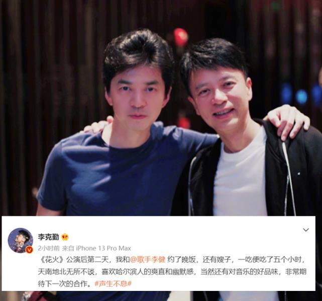 《声生不息》一公录完后,首次合作的双李意犹未尽,约饭就在当晚。两人话逢知己千句少,天南地北尽情畅聊,李克勤有感于李健的哈尔滨人的直爽和幽默,以及两人在音乐方面的共鸣,完全没有察觉到时光飞逝,一顿饭吃足了整整5小时。