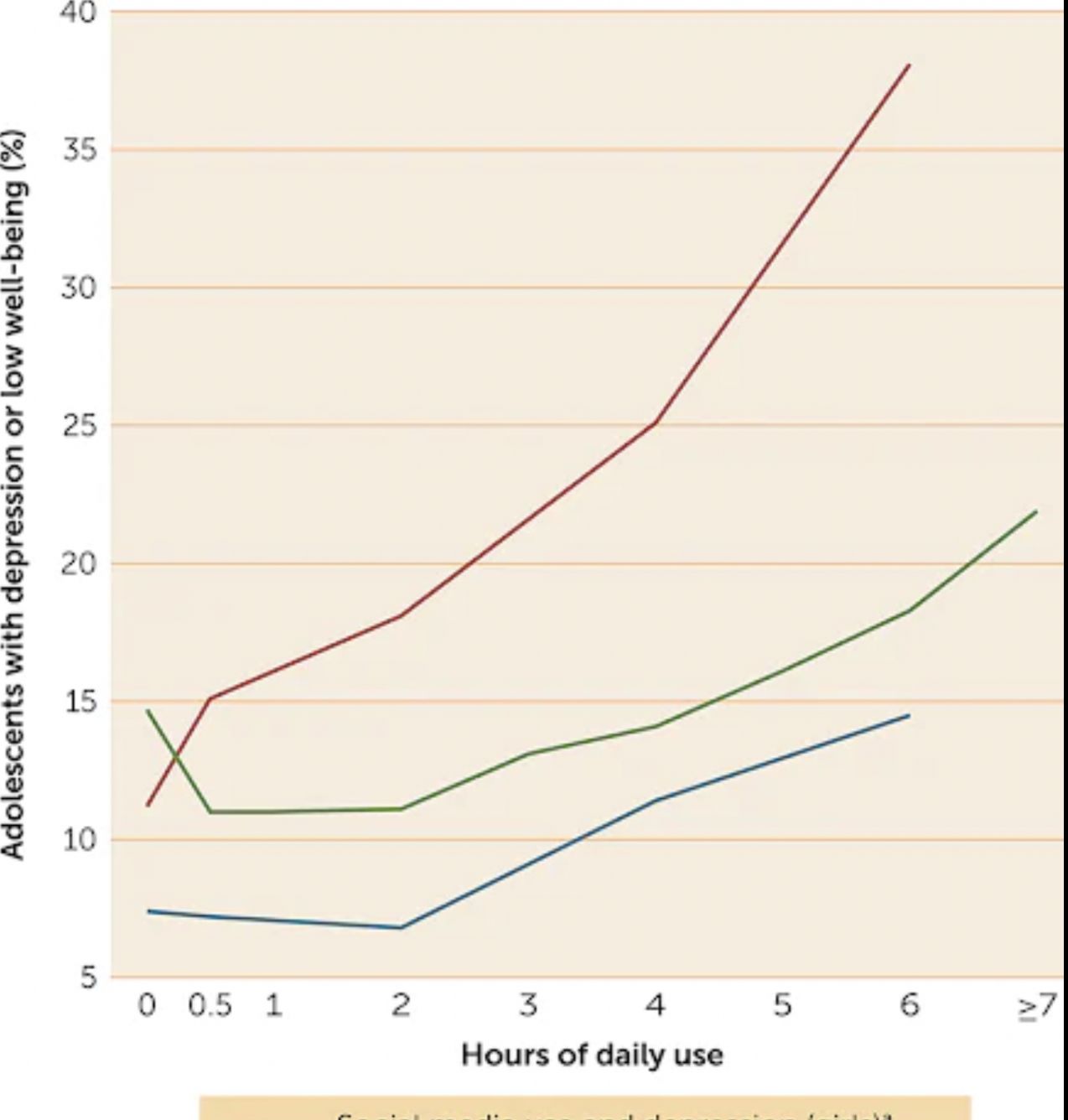 2020年,Jean M. Twenge 对心理健康和技术使用之间的联系进行了一项令人大开眼界的研究。她发现,从2011年开始,青少年中的抑郁症、自我伤害和自杀企图急剧增加,这与青少年群体中智能手机拥有率的上升直接相关。Twenge 还发现,在屏幕前的时间是决定幸福感的一个强有力的因素,重度科技使用者(即每天超过6小时)与轻度科技使用者(每天少于2小时)相比,幸福感更低的概率高出两倍之多。