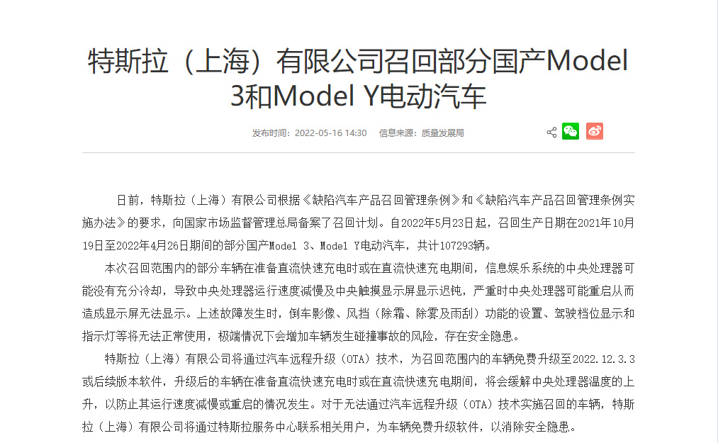 继逆变器存在质量问题之后,特斯拉又召回大量召回107293辆,召回生产日期2021年10月19日至2022年4月26日期间生产的部分国产Model 3和Model Y电动汽车。