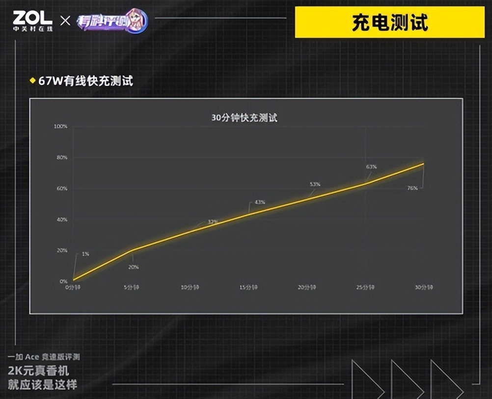 在续航方面,一加 Ace 竞速版也丝毫没有妥协。其采用了5000mAh电池与67W闪充技术,续航与充电体验甚至超越了部分旗舰级手机。在使用原装67W闪充充电器的情况下,通过实际测试,一加 Ace 竞速版可以在30分钟的时间内将电池电量从即将耗尽充至76%。
