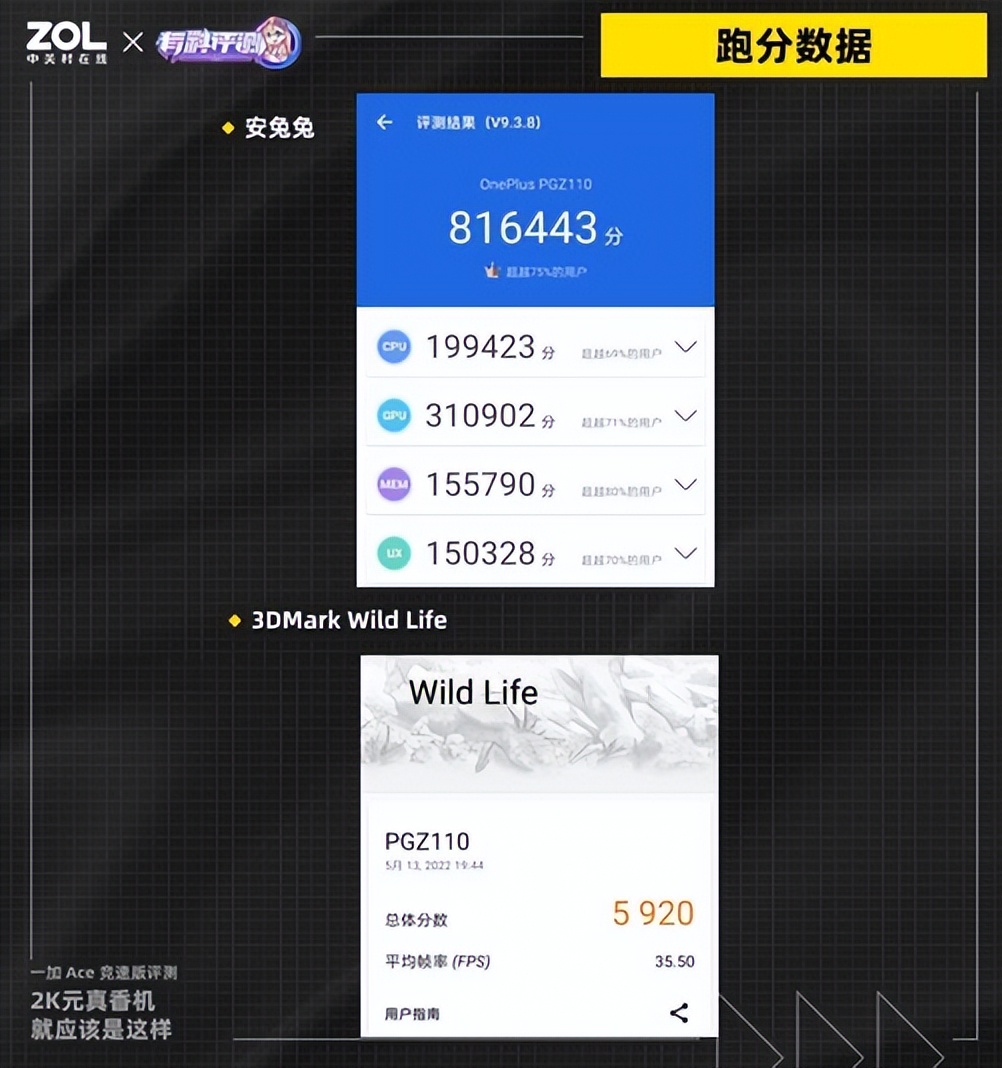 除了游戏测试之外,我们按照惯例进行了一加 Ace 竞速版的基准性能测试。在开启高性能模式下,一加 Ace 竞速版的基准测试成绩可以说相当令人满意。在安兔兔跑分测试中一加 Ace 竞速版 12GB+256GB版取得了81.6W分的优异成绩,并且在3DMark Wild Life测试中取得了5920分的优秀成绩。
