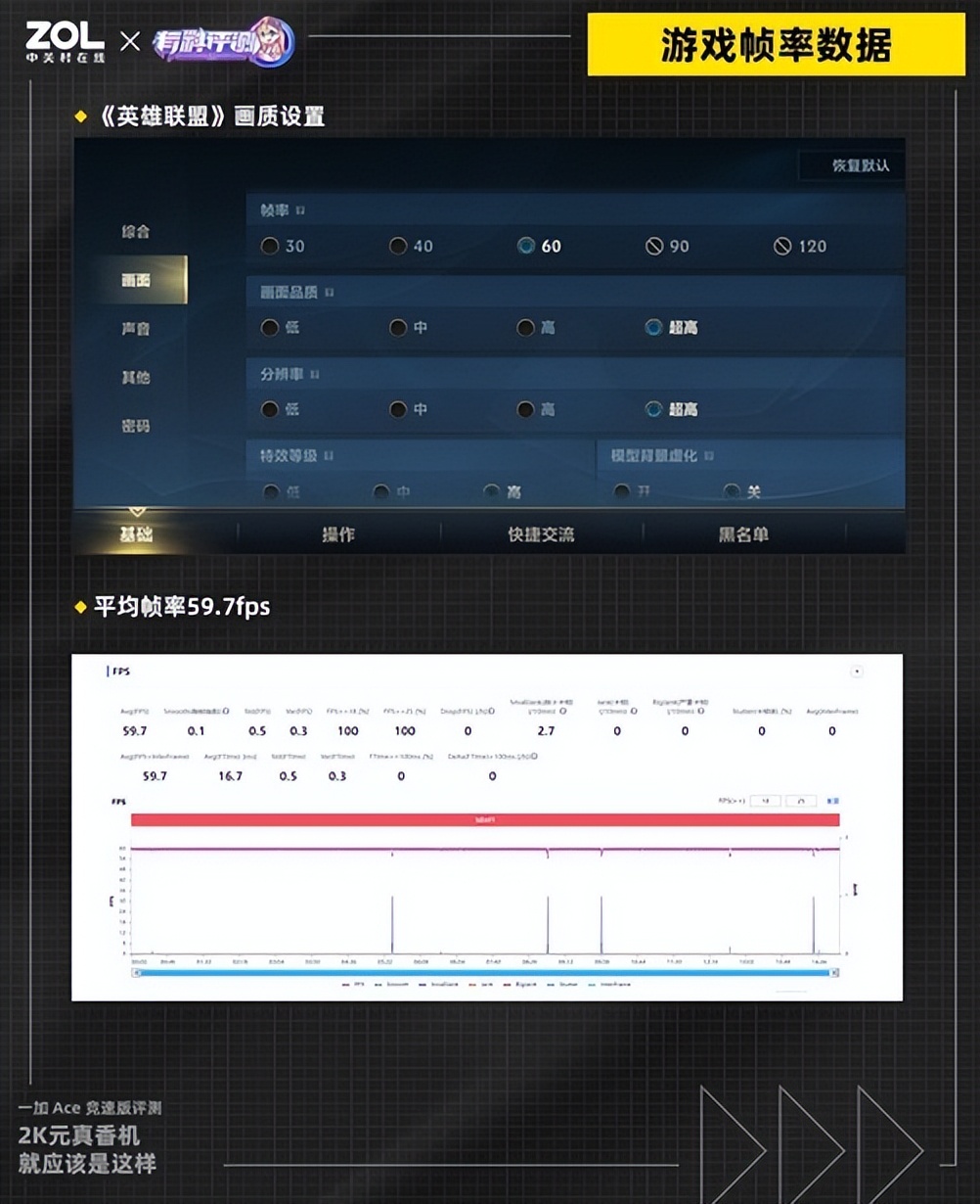 随后,我们在《英雄联盟手游》高画质全开+60帧模式下,一加 Ace 竞速版的15分钟平均帧率为59.7帧,游戏全程帧率表现非常稳定,没有出现掉帧和卡顿的情况,即使是团战时的帧率也十分稳定。