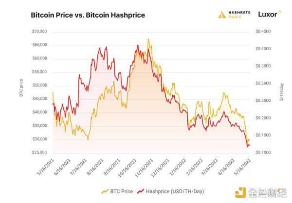 在过去一年中,26次比特币挖矿难度调整中有18次难度增加,仅有4次难度下降。当难度增加时,开采比特币变得更加能源密集,因此哈希价格下降。当比特币的价格下跌时,Hashprice 也会下跌,而现在,比特币的价格正在下跌,而此时难度处于历史最高水平。