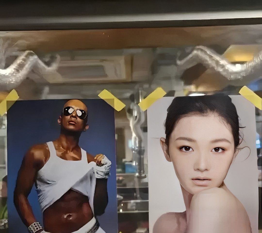 不仅仅在店内贴着大S的美照,在具俊晔与众人的合影画面中,我们还看到在餐厅大玻璃的外面也贴着大S的美照,当然这次多了一个具俊晔的照片,仍然是用黄胶带草草贴了上去,并且是两张单独的照片。