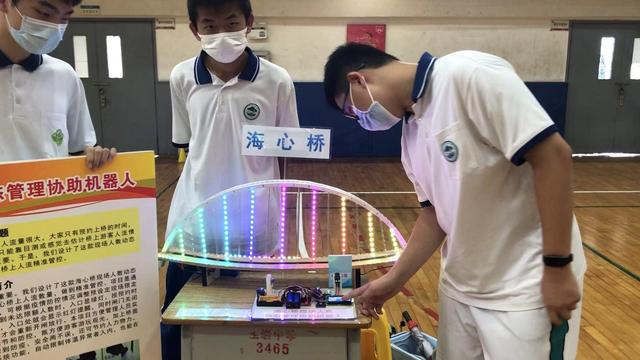 小蛮腰、海心桥构成了广州地标性建筑,来自中山大学附属中学初二的李同学、桂同学、黄同学三人,“操心”上了海心桥现场人流动态管理,为此他们设计了“海心桥现场人数动态管理协助机器人”,设定好限制人数之后,通过进出口管理机器人,管理桥上人数。若上桥人数多于限定数字,入口将自动封闭,桥上灯光引导人流下桥,直到桥上人数符合规定,入口才再次打开。
