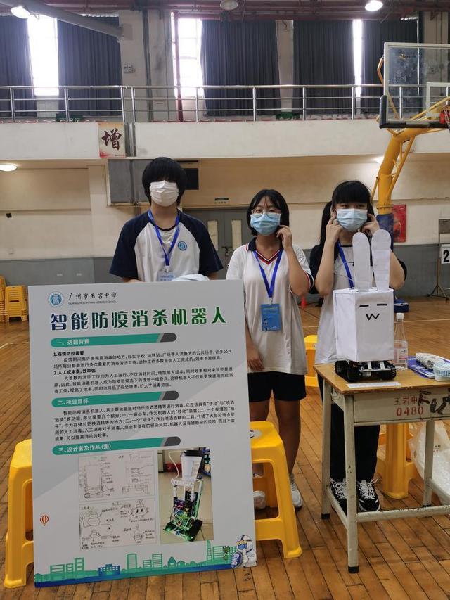 广州市玉岩中学高一的区嘉铭、张嘉仪、关嘉文三位同学研制了“智能防疫消杀机器人”,能对学校、地铁站、广场等人流量大的地方进行消杀。他们的机器人具有移动、喷洒消毒液等功能,外壳做成了可爱的兔子形状。